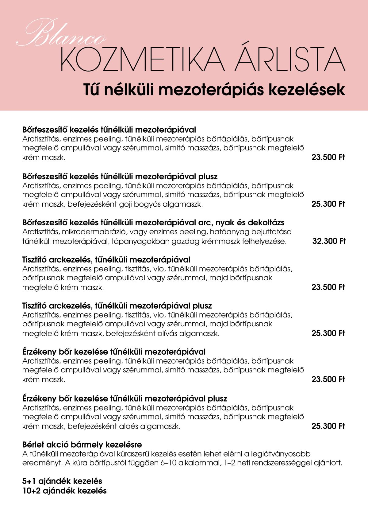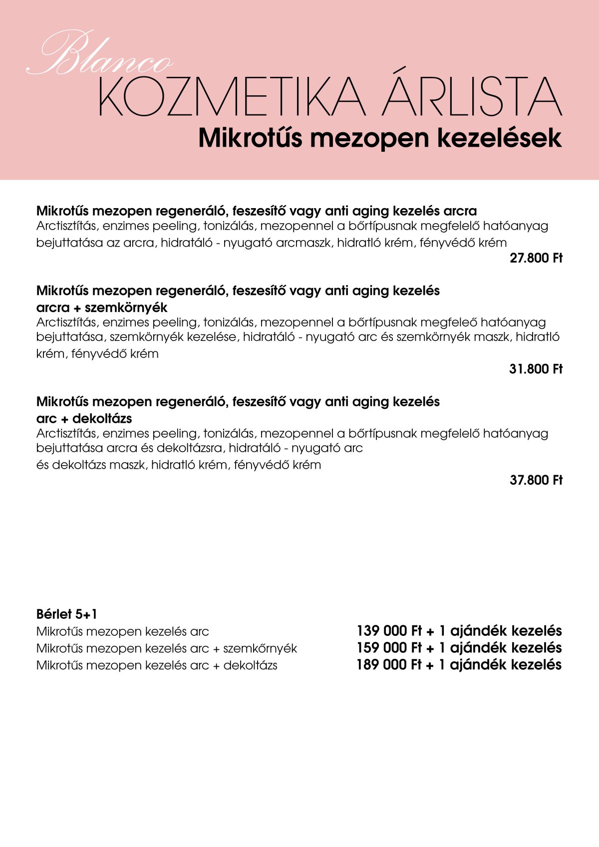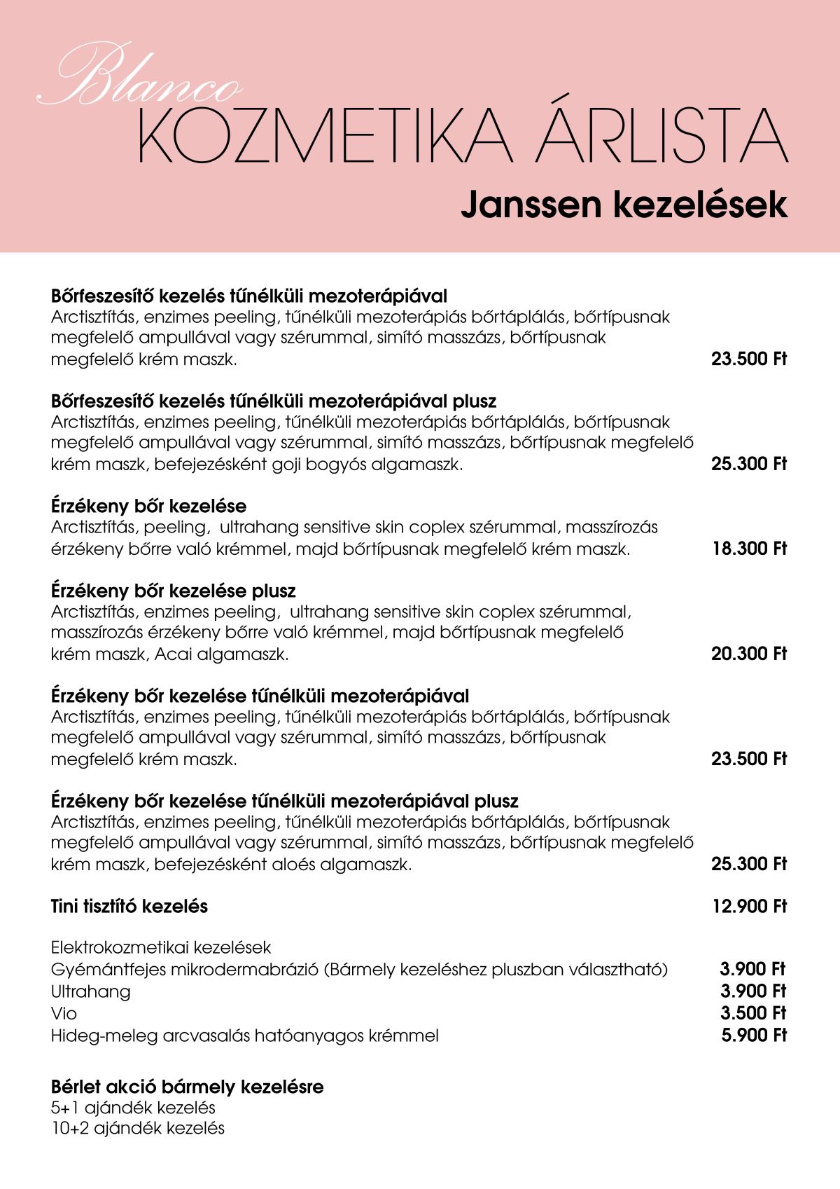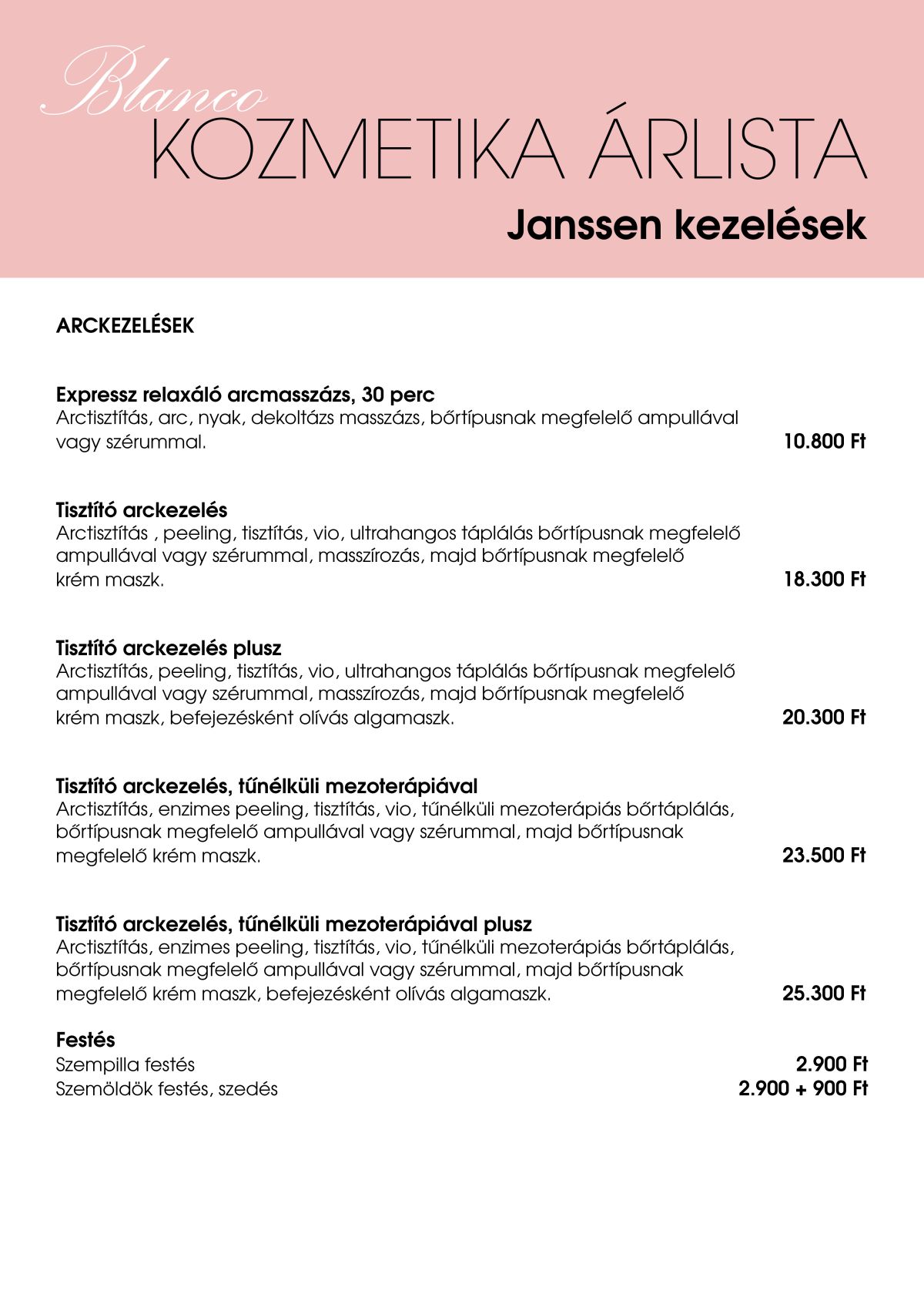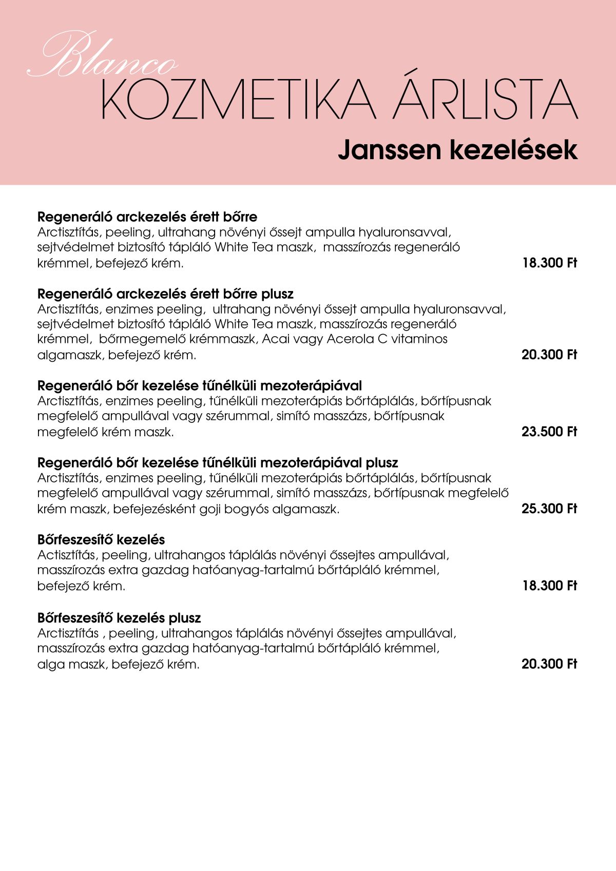 Itt a Blanco Kozmetika árlista található, látod a kezelések megnevezésével, azok részletes leírásával. (További részletek a Kozmetikai kezelések és az Elektrokozmetikai kezelések menüpontok alatt!)